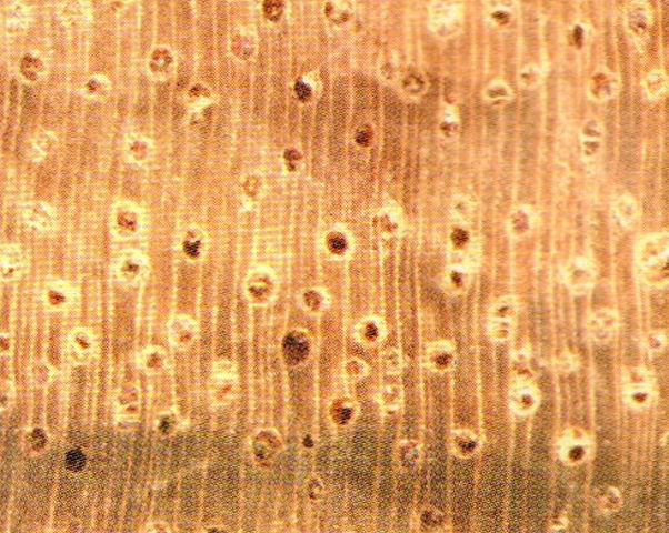 散孔材。管孔肉眼下可见,少,大小中等;主为单管孔,少数径列复管孔(2~3个);具黑色树胶和侵填体。轴向薄壁组织放大镜下明显,略少,环管束状及短翼状。木射线放大镜下明显,密度中,窄。