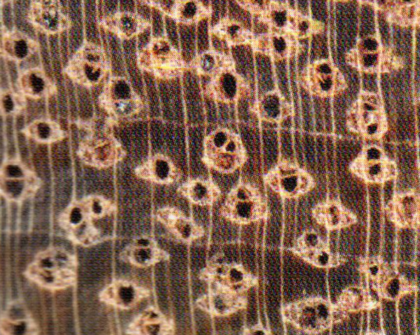 散孔材。管孔肉眼下明显,少,略大;主为单管孔,少数经列或斜列复管孔(2~3个);具黑色树胶及硫黄色沉积物。轴向薄壁组织肉眼下明显,发达,翼状、聚翼状及轮界状。木射线放大镜下明显,密度中,甚窄。