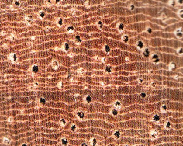 心边材略明显。心材暗红褐色带紫色调,心部具不规则花纹。边材色稍浅,宽3~4cm。生长轮略明显,轮间界以深色组织带。