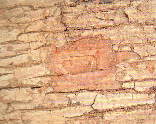厚1.0~3.0cm,质略硬,不易剥离。外皮灰白色至灰褐色;具规则的纵裂,呈小片状脱落。内皮浅紫红色: 韧皮纤维略发达。