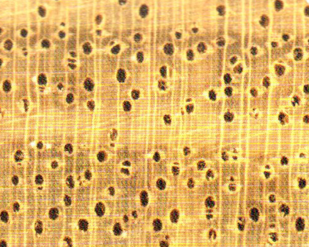 散孔材。管孔肉眼下可见略少,略大;主为单管孔,少数径列复管孔(2~3个);具侵填体。轴向薄壁组织放大镜下明显,短翼状及聚翼状。木射线放大镜下明显。密度中,窄。